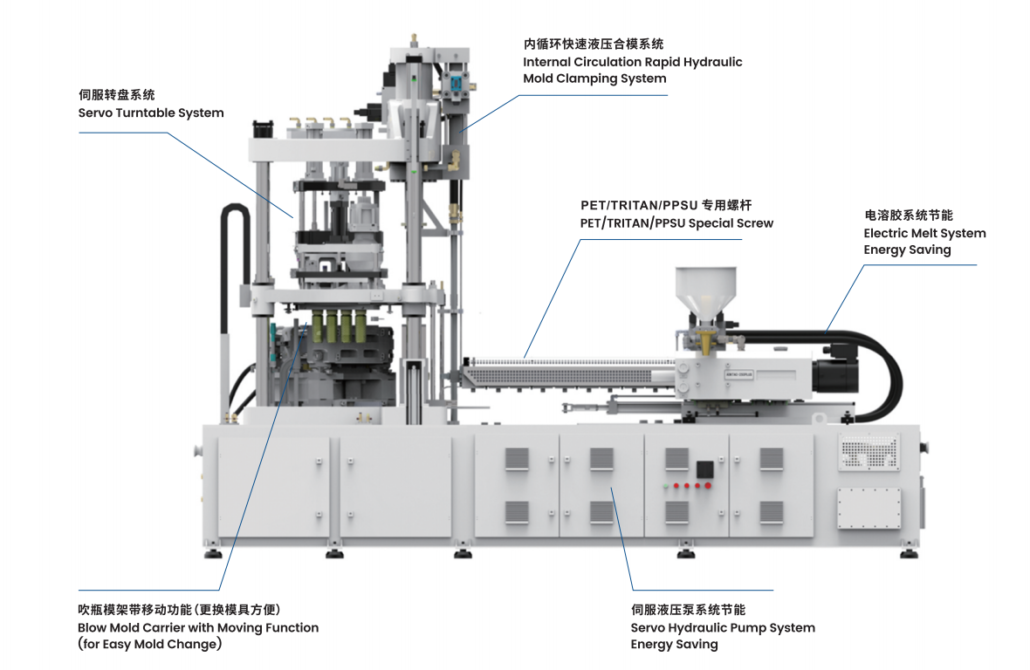 The 3-station type directly utilizes the residual heat of the injeected preform for temperature conditioning within the mold. resulting in lower energy consumption.Molds employ a valve-gated hot runner system.